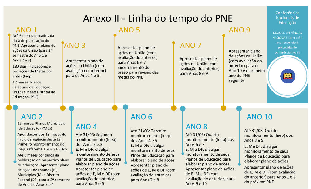 - Monitoramento (Inep), até 31 de março, dos índices dos 2 (dois) exercícios anteriores (art. 11). - Divulgação de informações referentes aos planos de Estados, Distrito Federal e Municípios, para elaborar seus planos de ações (art. 8º). - Avaliação e apresentação de planos de ações de Estados, Distrito Federal e Municípios para os 2 (dois) exercícios seguintes (art. 13). - Envio, até 30 de junho, pelo governo federal, do projeto de lei do plano decenal de educação subsequente, com avaliação e resultados parciais deste PNE, com base em dados do Inep (art. 35). |