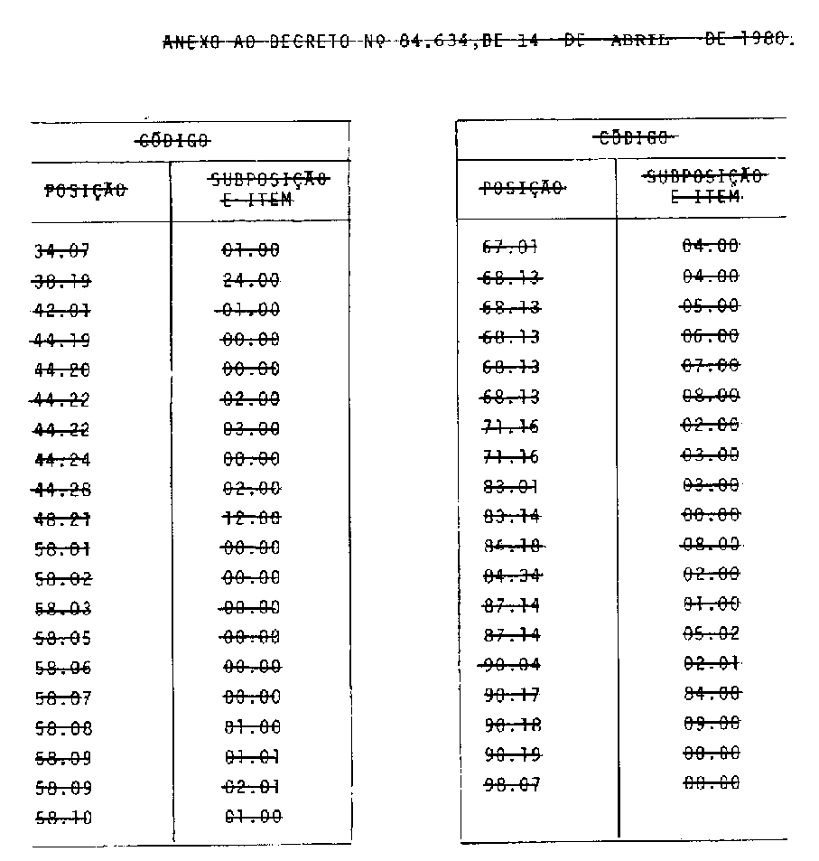classificados nos códigos da Tabela aprovada pelo Decreto nº 84.338, de 26 de
