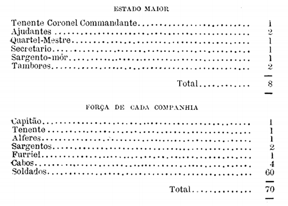 O Batalhão será composto de seis companhias, tres em Villa Nova e tres no Propriá, podendo augmentar-se o numero das Companhias sempre que o permittir o augmento da povoação em qualquer das villas.