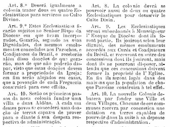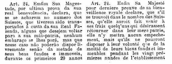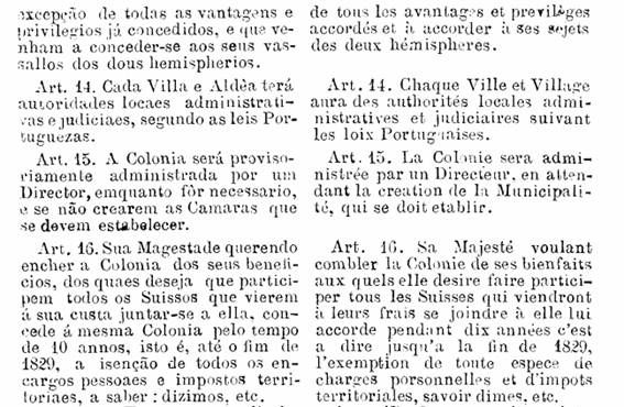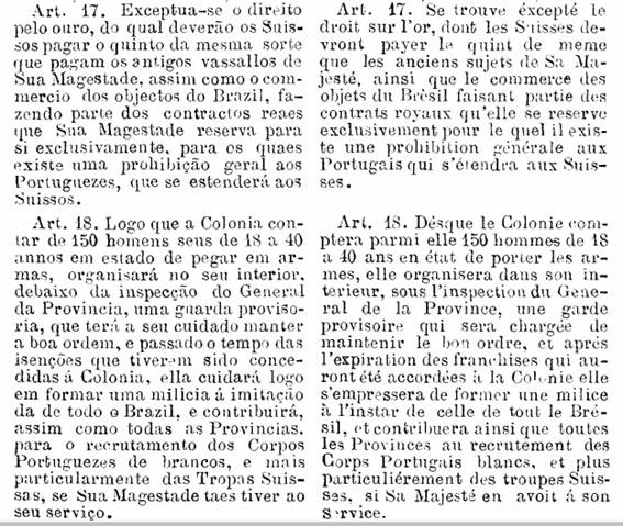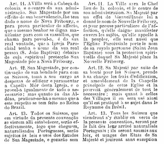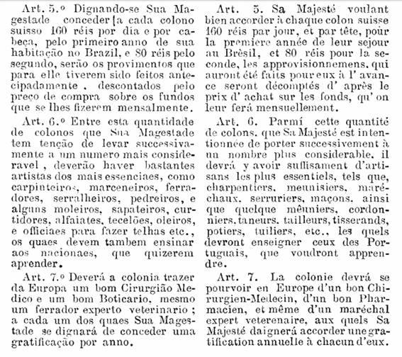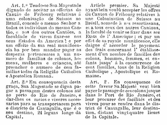 Fui servido approvar as condições na data de 11 do corrente mez, aceitas pelo Agente do Cantão de Fribourg, Sebastião Nicoláo Gachet, que acompanham este decreto, e com as quaes concedi a permissão para o estabelecimento neste meu Reino do Brazil de uma Colonia de suissos composta de 100 familias. Thomaz Antonio de Villanova Portugal, do meu Conselho, Ministro e Secretario de Estado dos Negocias do Reino, encarregado interinamente da Repartição dos Negocias Estrangeiros, e da Guerra, e da Presidencia, do meu Real Erario assim o tenha entendido e faça executar com os despachos necessarios.