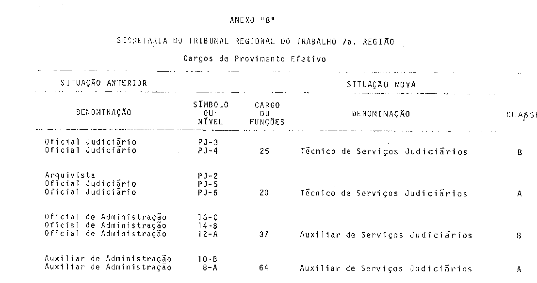 Art. 7º No prazo de 90 (noventa) dias, contado da vigência desta Lei, os atuais ocupantes efetivos dos cargos de Oficial Judiciário, PJ-3 e PJ-4, poderão ser aproveitados em cargos da classe B da carreira de Técnico de Serviços Judiciários e na classe A, da mesma carreira, os ocupantes efetivos dos cargos de Arquivista PJ-2, e Oficial Judiciário, PJ-5 e PJ-6; em cargos da classe B da carreira de Auxiliar de Serviços Judiciários os ocupantes efetivos dos cargos de Oficial de Administração 16-C, 14-B e 12-A, e em cargos da classe A, dessa última carreira, os ocupantes efetivos dos cargos de Auxiliar de Administração 10-B e 8-A.