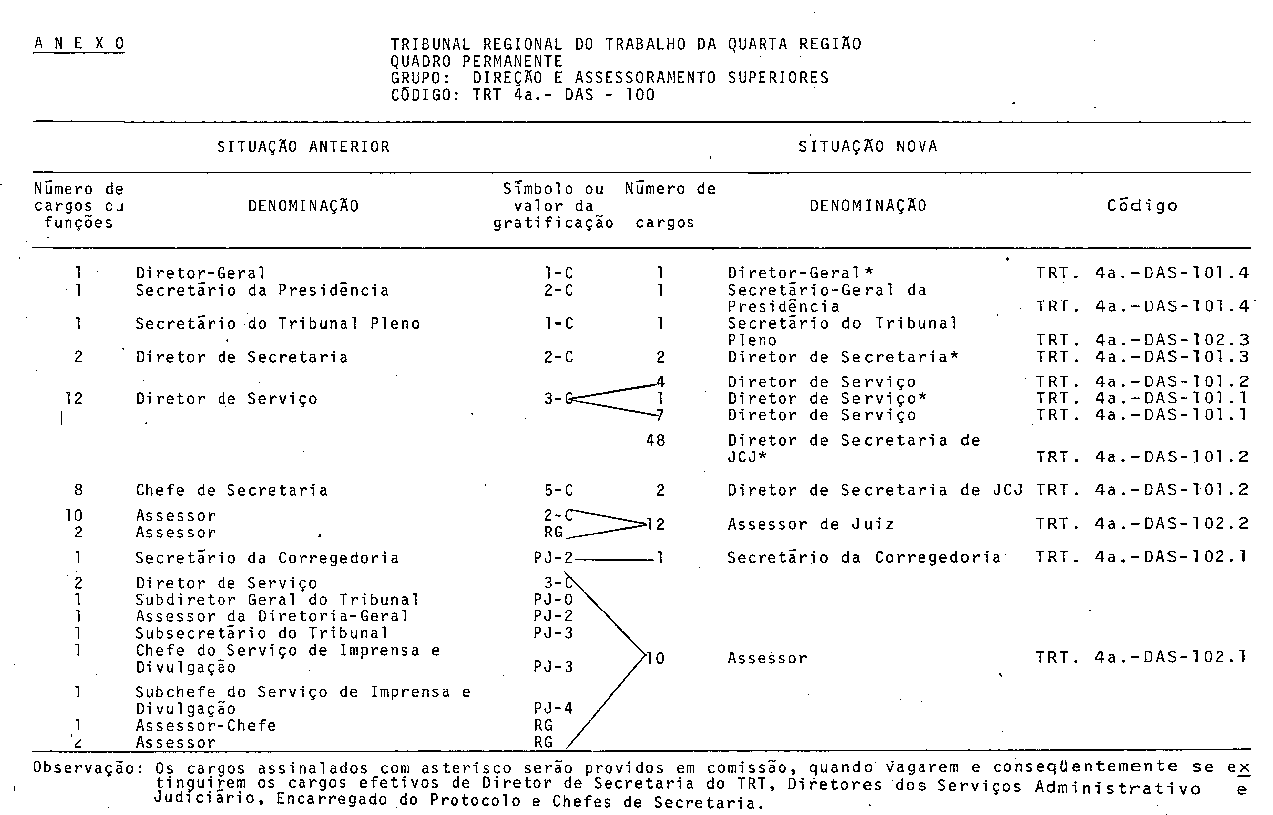 Art. 6º Ficam criados, no Quadro Permanente da Secretaria do Tribunal Regional do Trabalho da Quarta Região, 48 (quarenta e oito) cargos de Diretor de Secretaria de Junta de Conciliação e Julgamento, código TRT-4ª.DAS-101.2.