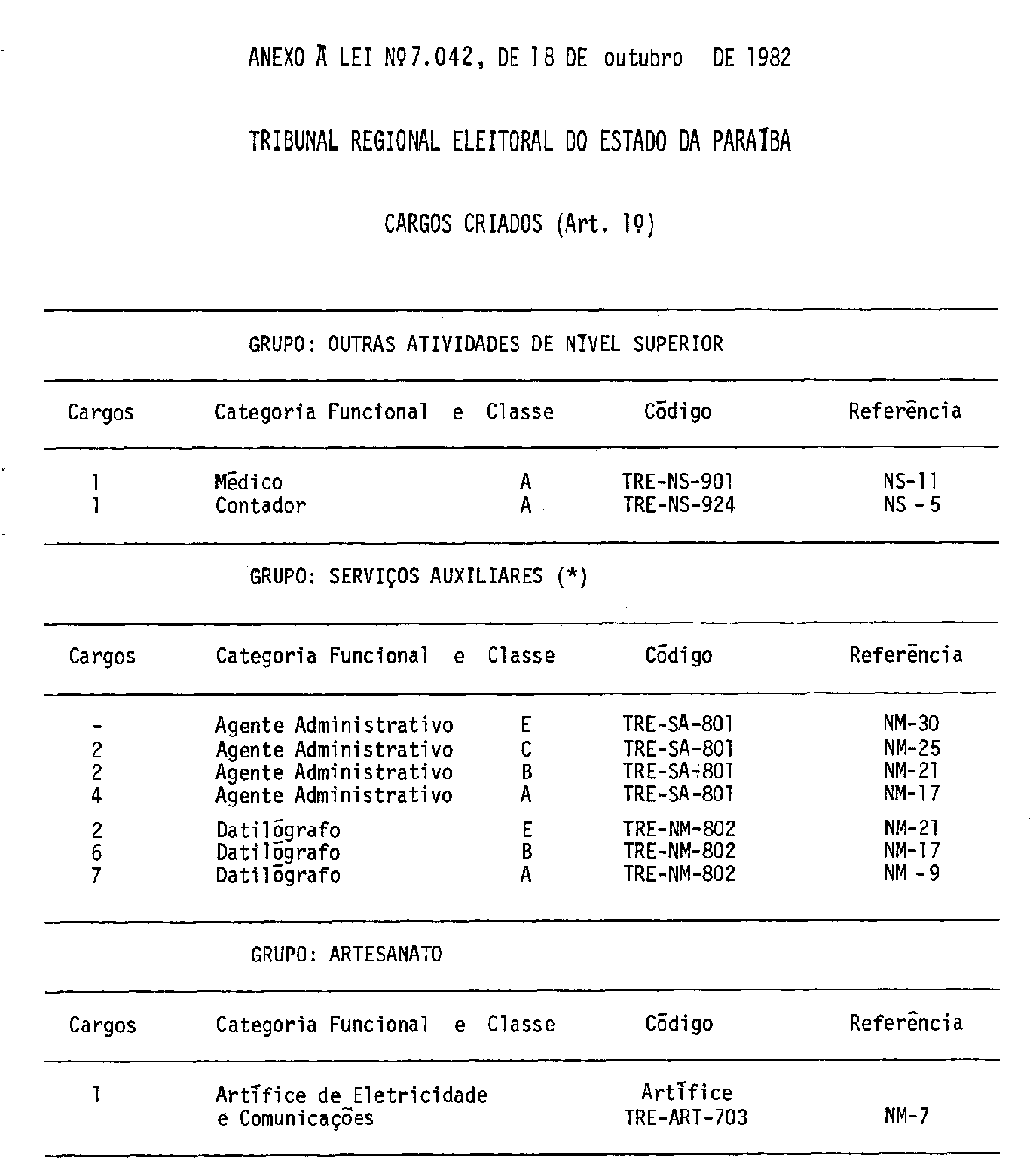 Art. 1º - Ficam criados, no Quadro Permanente da Secretaria do Tribunal Regional Eleitoral do Estado da Paraíba, os cargos constantes do Anexo a esta Lei.