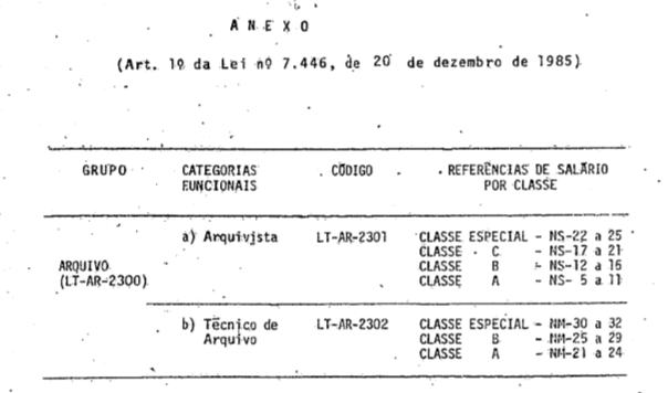Art. 1º - Aos níveis de classificação de empregos integrantes do Grupo-Arquivo, código LT-AR-2300, criado com funcionamento no art. 4º da Lei nº 5.645, de 10 de dezembro de 1970, correspondem as referências de salário estabelecidas no Anexo desta Lei.