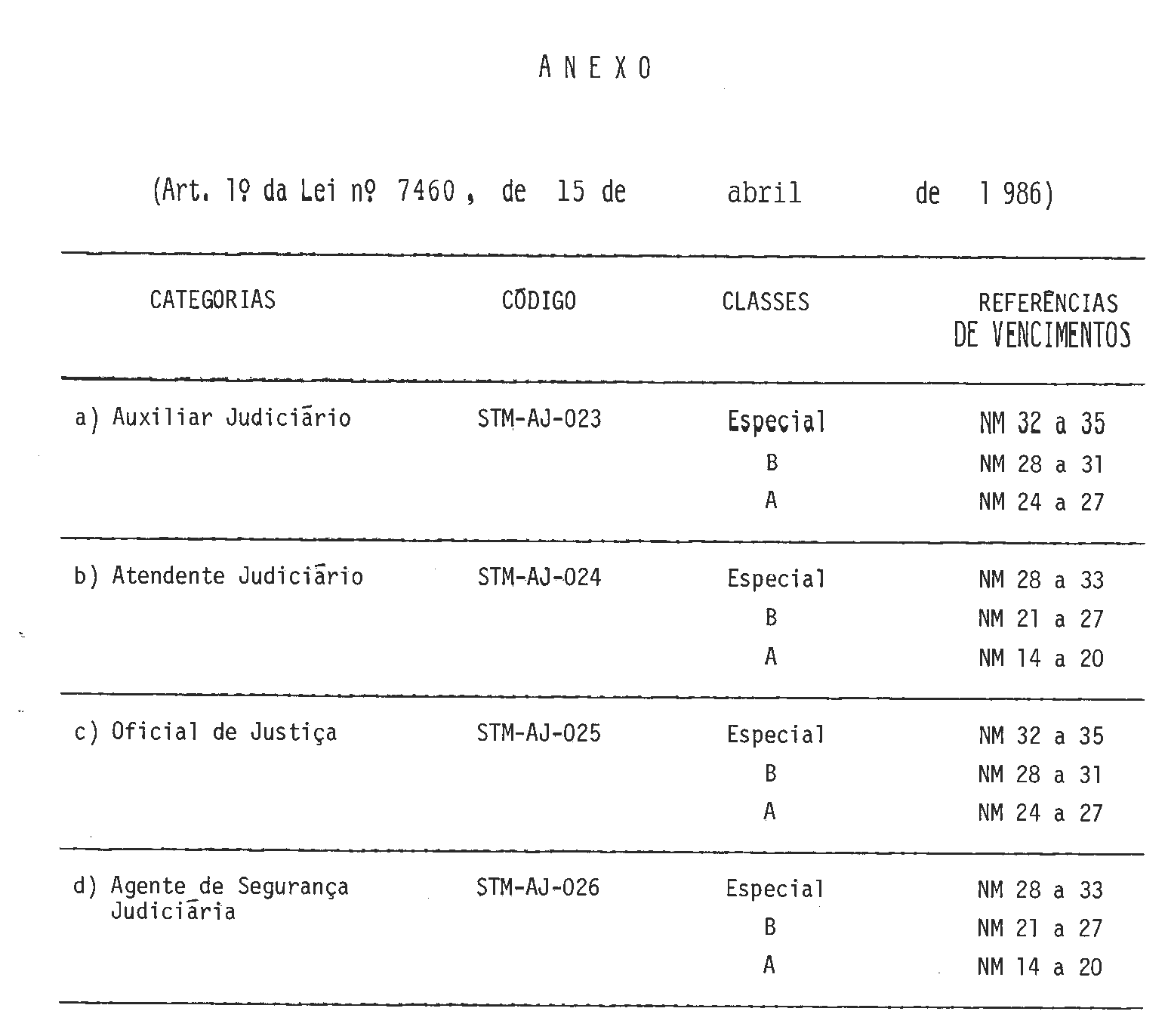 Art. 1º As Categorias Funcionais de Auxiliar Judiciário, código STM-AJ-023, Atendente Judiciário, código STM-AJ-024, Oficial de Justiça, código STM-AJ-025 e Agente de Segurança Judiciária, código STM-AJ-026, do Grupo-Atividades de Apoio Judiciário, código STM-AJ-020, dos Quadros Permanentes das Secretarias do Superior Tribunal Militar e das Auditorias da Justiça Militar passam a ser estruturadas na forma constante do Anexo desta lei.