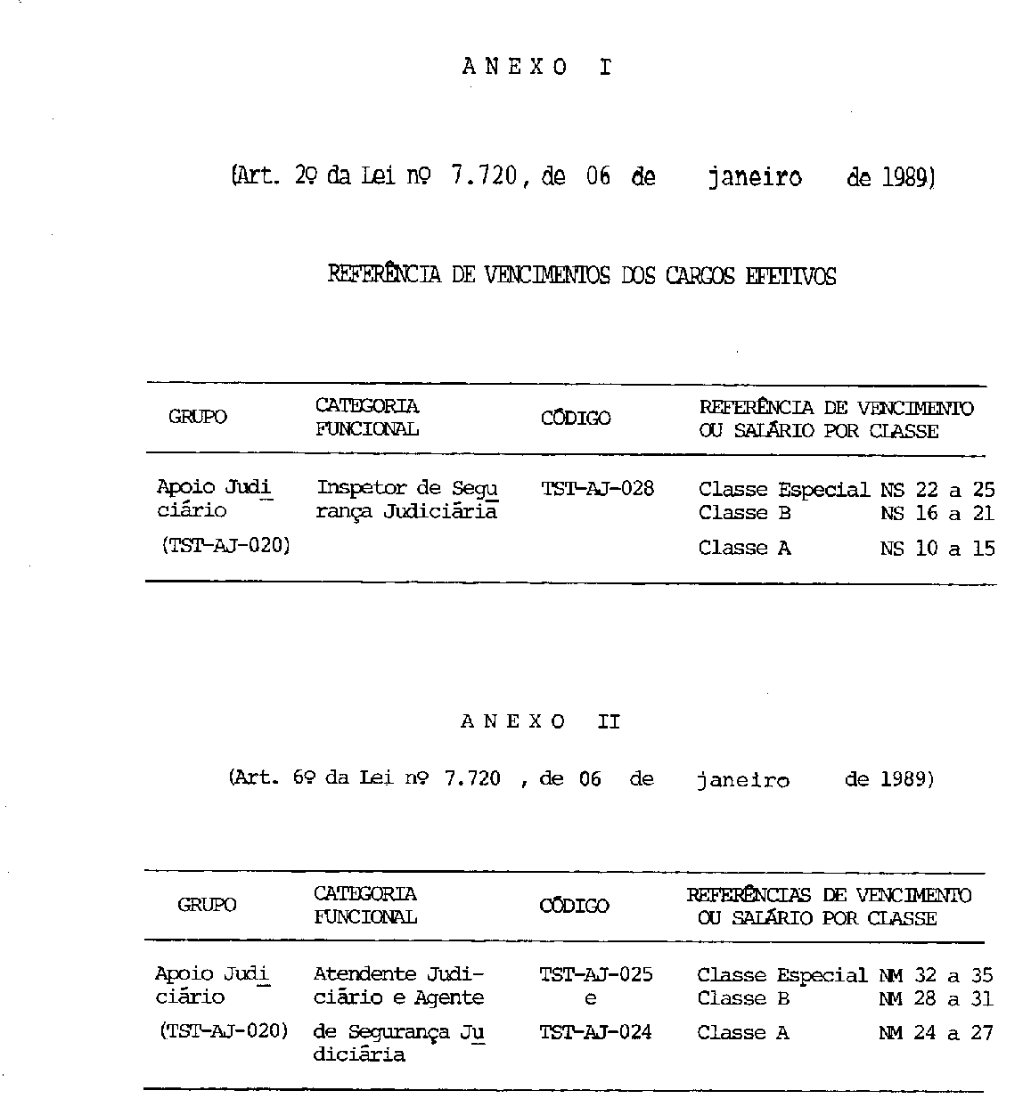 Art. 6° As Categorias Funcionais de Agente de Segurança Judiciária, Código TST-AJ-024, e de Atendente Judiciário, Código TST-AJ-025, do Grupo-Atividades de Apoio Judiciário, da Secretaria do tribunal Superior do Trabalho, passam a ser estruturadas na forma do Anexo II desta Lei.