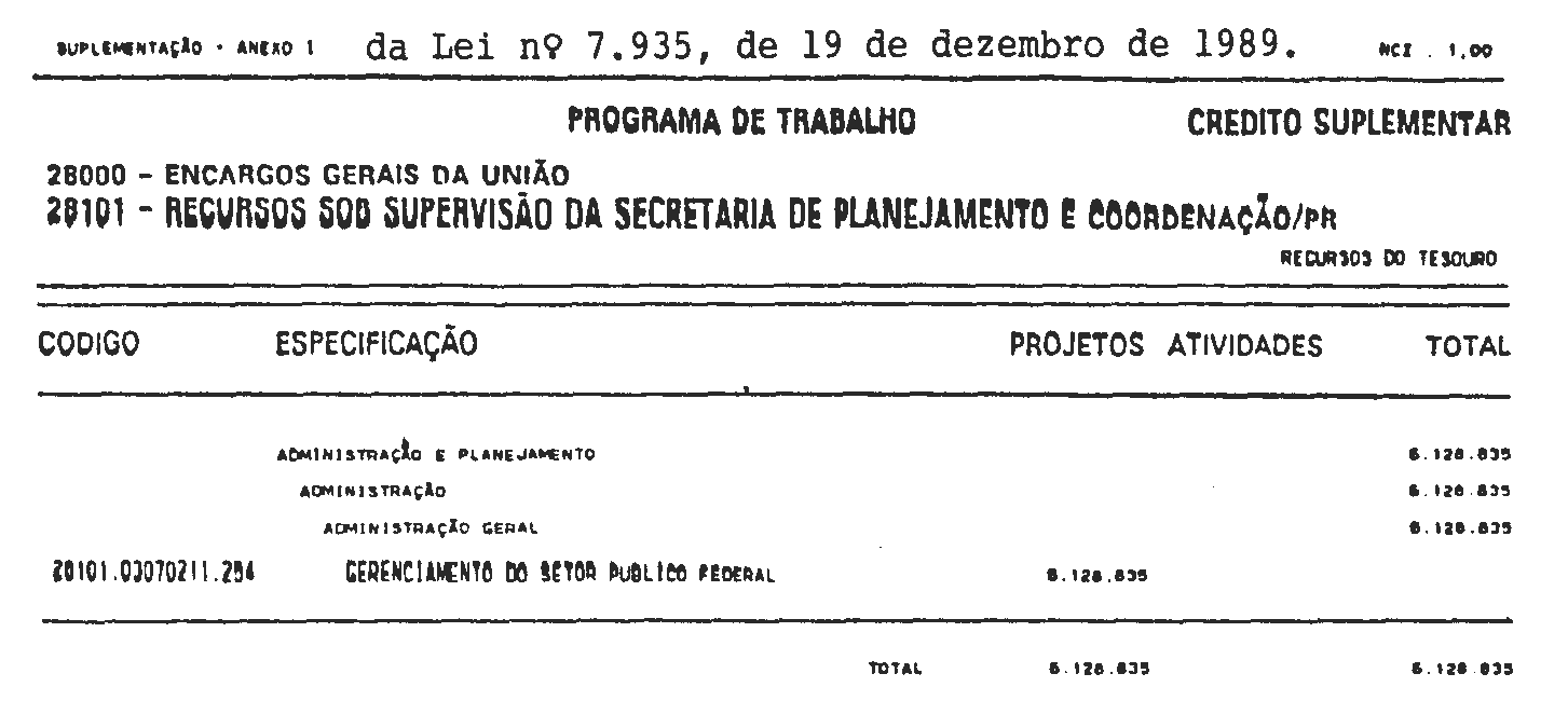 Art. 1° É o Poder Executivo autorizado a abrir ao Orçamento Fiscal da União (Lei n° 7.715, de 3 de janeiro de 1989) o crédito suplementar até o limite de NCz$ 6.128.835,00 (seis milhões, cento e vinte e oito mil, oitocentos e trinta e cinco cruzados novos), de conformidade com a programação constante do Anexo I desta Lei.