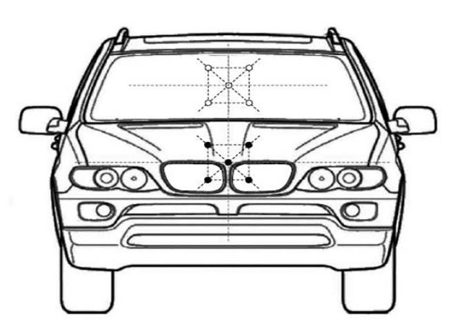 d) Dever ão se realizar dez impactos a 90º, com armas 9mm FMJ ou 44Magnum Lead SWC Gas Checked, nos pontos asinalados nas figuras a seguir.