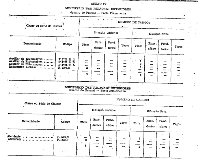 Art. 4º São considerados reclassificados, na conformidade dos quadros numéricos e relação nominal constantes dos Anexos III e IV, os cargos de Enfermeiro Auxiliar, P.1706.8 e de Atendente, P.1703.7, do Quadro de Pessoal - Partes Permanente, Suplementar e Especial do Ministério das Relações Exteriores, de acôrdo com o disposto no Decreto-lei nº 299, de 28 de fevereiro de 1967.