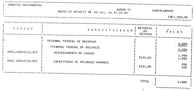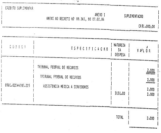 Art. 1º - Fica aberto ao Tribunal Federal de Recursos o crédito suplementar no valor de Cr$ 2.000.000,00 (dois milhões de cruzeiros) para reforço de dotação orçamentária indicada no anexo I deste Decreto.