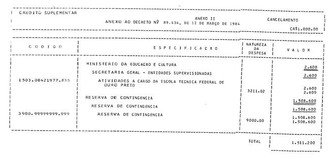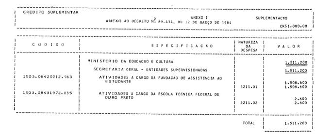 Art. 1º - Fica aberto ao Ministério da Educação e Cultura, em, favor da Escola Técnica Federal de Ouro Preto e Fundação de Assistência ao Estudante, o crédito suplementar no valor de Cr$ 1.511.200.000,00 (hum bilhão, quinhentos e onze milhões e duzentos mil cruzeiros), para reforço de dotações orçamentárias indicadas no anexo I deste Decreto.