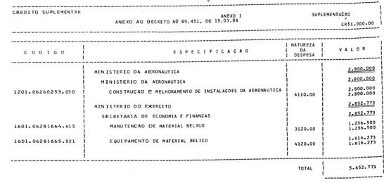 Abre aos Ministérios da Aeronáutica e do Exército, crédito suplementar no valor de Cr$ 5.652.773.000,00, para reforço de dotações consignadas no vigente Orçamento. |
