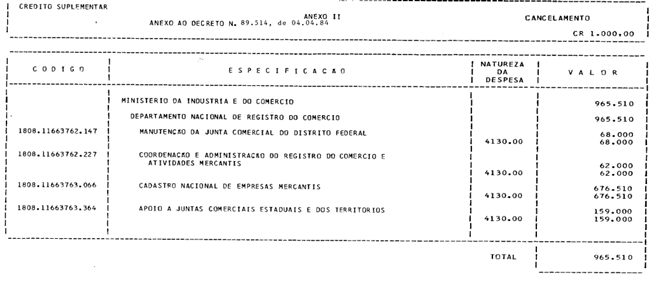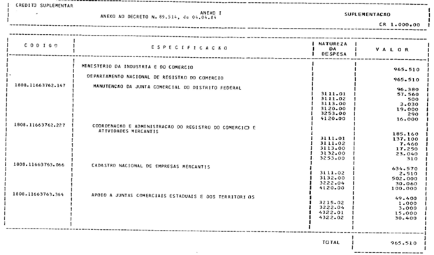 . 1º - Fica aberto ao Ministério da Indústria e do Comércio, em favor do Departamento Nacional de Registro do Comércio - DNRC, o crédito Suplementar no valor de Cr$ 965.510.000,00 (novecentos e sessenta e cinco milhões, quinhentos e dez mil cruzeiros), para reforço de dotações orçamentárias indicadas no Anexo I deste Decreto.