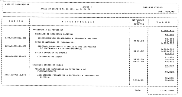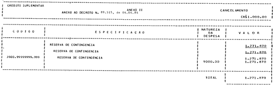 - Fica aberto ao Orçamento da União, em favor de diversas unidades orçamentárias, o crédito suplementar no valor de Cr$ 1.271.870.000,00 (um bilhão, duzentos e setenta e um milhões, oitocentos e setenta mil cruzeiros), para reforço de dotações orçamentárias indicadas no anexo I deste Decreto.