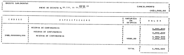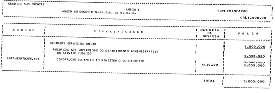. 1º - Fica aberto ao Subanexo Encargos Gerais da União - Recursos sob Supervisão do Departamento Administrativo do Serviço Público, o crédito suplementar no valor de Cr$ 3.000.000.000,00 (três bilhões de cruzeiros), para reforço de dotação orçamentária indicada no anexo I deste Decreto.