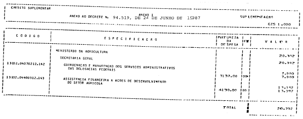Secretaria-Geral, o crédito suplementar de CZ$ 20.392.000,00 (vinte milhões,
