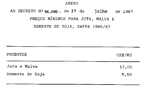 da safra 1986/87, para juta e malva e semente de soja, que passam a viger com os