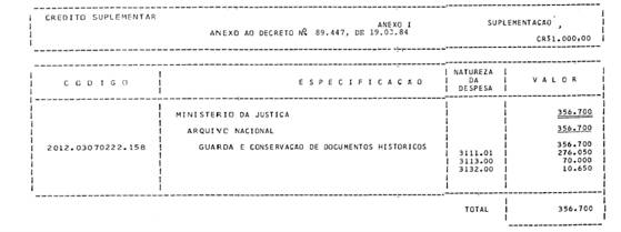 | Revogado pelo Decreto de 15 de fevereiro de 1992 | Abre ao Ministério da Justiça, em favor do Arquivo Nacional, o crédito suplementar no valor de Cr$ 356.700.000,00, para reforço de dotações consignadas no vigente Orçamento. |