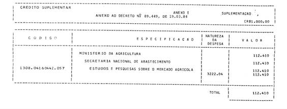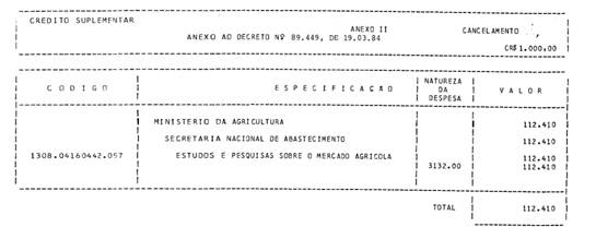 | Revogado pelo Decreto de 15 de fevereiro de 1992 | Abre ao Ministério da Agricultura, em favor da Secretaria Nacional de Abastecimento - SNAB, o crédito suplementar no valor de Cr$ 112.410.000,00, para reforço de dotação consignada no vigente Orçamento. |