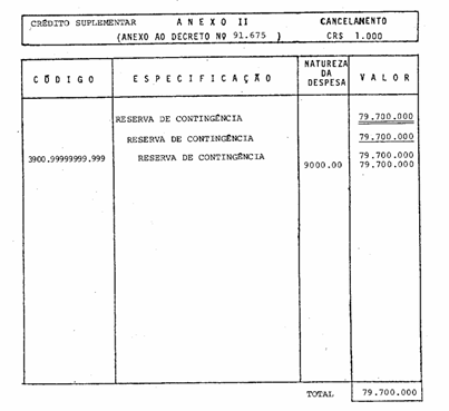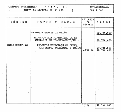Art. 1º Fica aberto ao subanexo Encargos Gerais da União - Recursos sob Supervisão da Secretaria de Planejamento/PR, o crédito suplementar no valor de Cr$ 79.700.000.000 (setenta e nove bilhões e setecentos milhões de cruzeiros), para reforço de dotação orçamentária indicada no anexo I deste Decreto.
