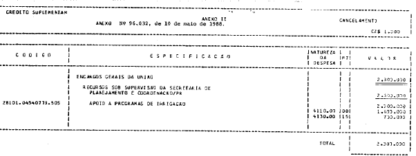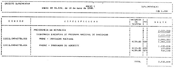 Executiva do Programa Nacional de Irrigação, o crédito suplementar de CZ$