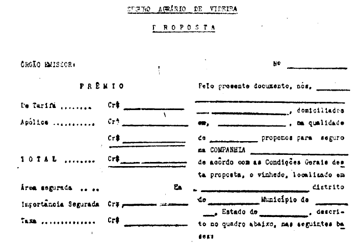 A presente apólice e emitida de conformidade com as declarações da proposta do Segurado e as condições constantes da tarifa do seguro agrário de videira, aprovadas por ato do D. N. S. P. C. e postas em vigor pelo Poder Executivo, as quais são consideradas parte integrante e complementar desta apólice e obrigam o Segurado como se nela estivesse transcritas.
