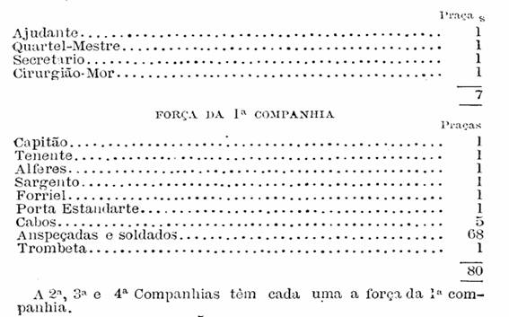 1.º O Regimento de Cavallaria do Milícias n. 4 se comporá de oito companhias reduzindo-se a este numero as 14 já existentes que formarão o Corpo de Cavallaria das Villas de Rezende e de S. João do Principe, da maneira seguinte: