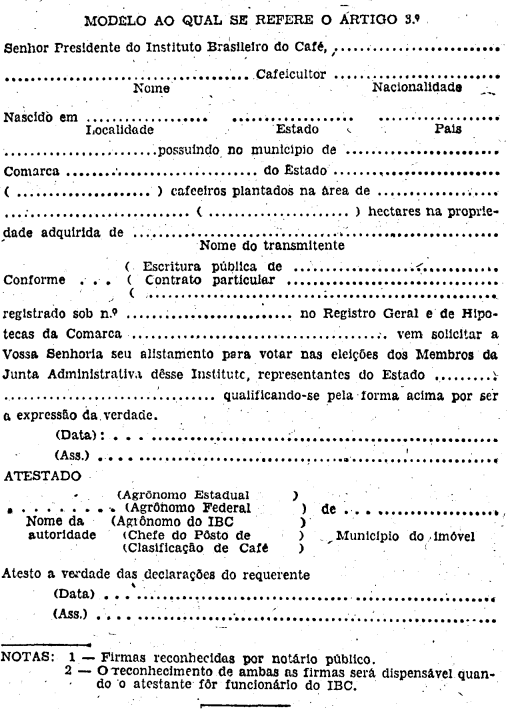 § 1º A veracidade das declarações constantes do requerimento de inscrição será atestada no mesmo documento, segundo critério normativo adotado pela Diretoria do IBC, pelo Agrônomo Estadual, Federal ou do IBC com jurisdição sôbre a área em que estiver localizada a propriedade cafeeira, ou pelo Chefe do Pôsto de Classificação do IBC, ou mantido por entidade estadual em acôrdo com o IBC, devendo ser reconhecidas as firmas do requerente e da autoridade atestante, ficando ambos os reconhecimentos dispensados, no caso de ser o atestante funcionário da Autarquia.