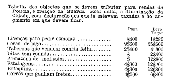 Crêa diversos impostos com applicação ás despezas da Divisão Militar da Guarda Real da Policia e da illuminação desta Cidade.