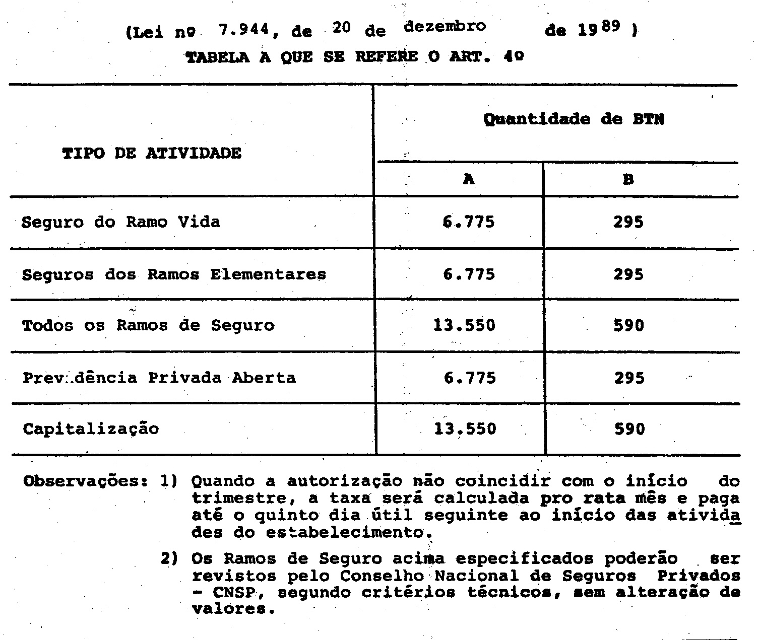 Art. 4º Os valores da Taxa, expressos em Bônus do Tesouro Nacional - BTN, são os constantes da Tabela anexa, devidos em cada trimestre, de acordo com o tipo de atividade, apurados conforme os seguintes critérios: