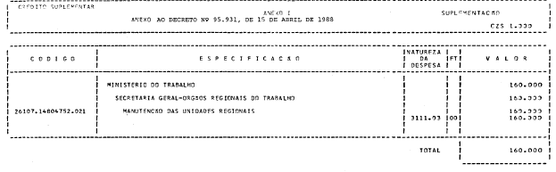 - Órgãos Regionais do Trabalho, o crédito suplementar de CZ$ 160.000.000,00