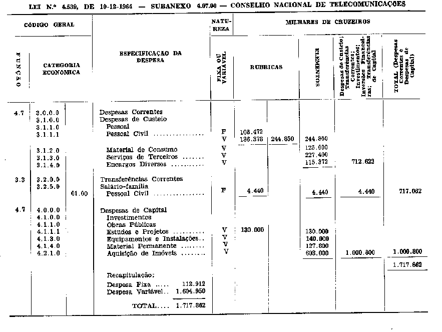 Art. 1º Fica alterado, na forma do Quadro Anexo, o Subanexo 4.07.00 - Conselho Nacional de Telecomunicações - da Lei nº 4.539, de 10 dezembro de 1964.