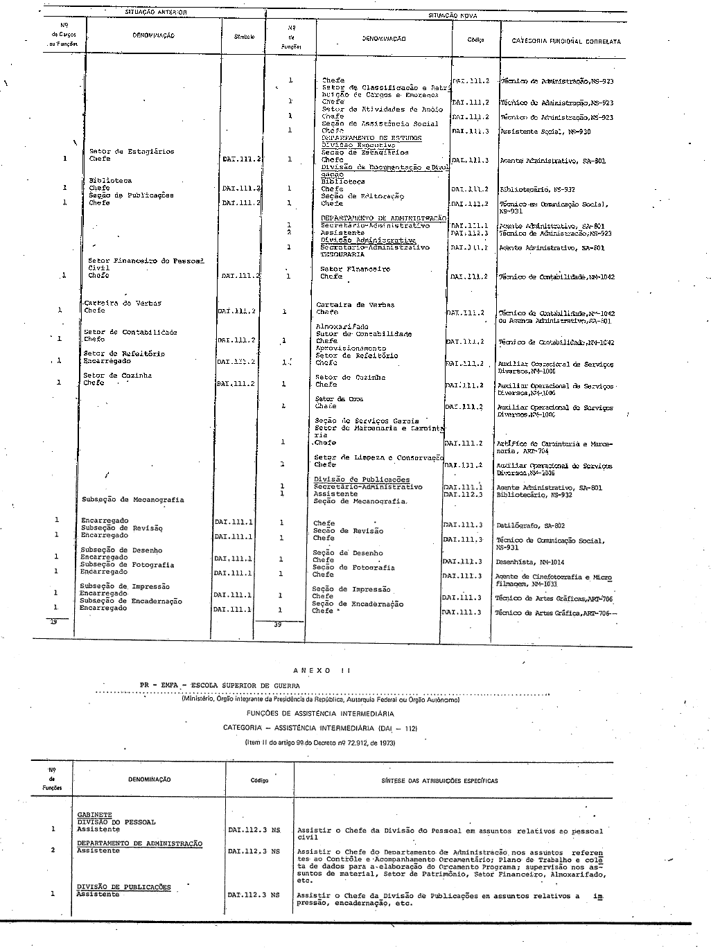. 1º - São criadas, mantidas, reclassificadas e transformadas funções, na forma do Anexo I deste decreto, para composição das Categorias Direção Intermediária, código: DAI-111, e Assistência Intermediária, código: DAI-112, do Grupo-Direção e Assistência Intermediárias, código: DAI-110, do Quadro Permanente da EscoIa Superior de Guerra.