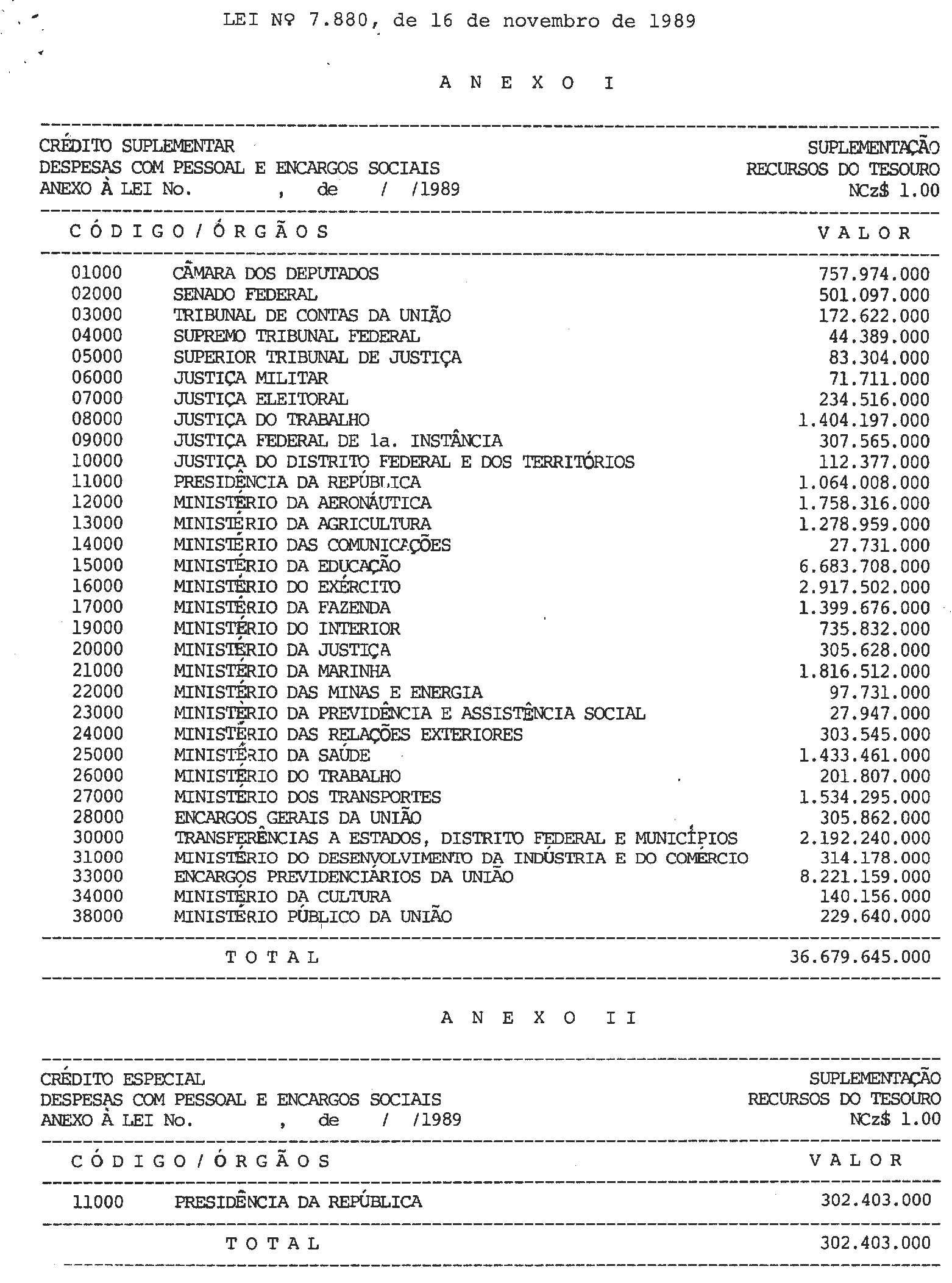 Art. 1º É Poder Executivo autorizado a abrir ao Orçamento Fiscal da União, Lei nº 7.715, de 3 de janeiro de 1989, créditos adicionais até o limite de NCz$ 36.982.048.000,00 (trinta e seis bilhões, novecentos e oitenta e dois milhões e quarenta e oito mil cruzados novos), para atender despesa com pessoal e encargos sociais, sendo: