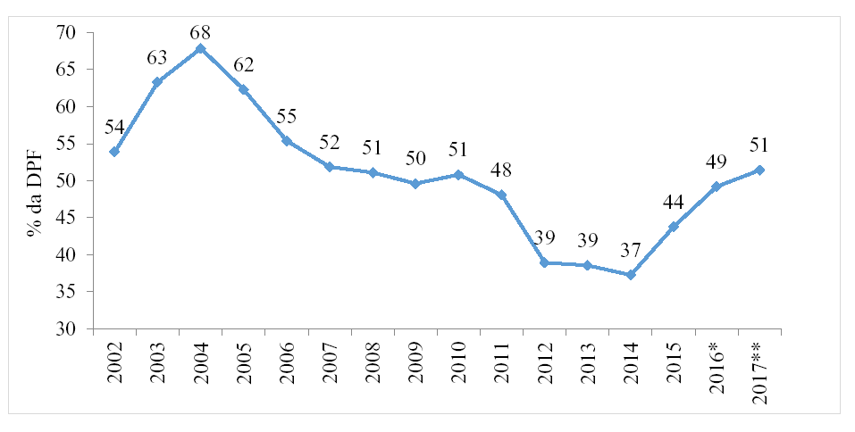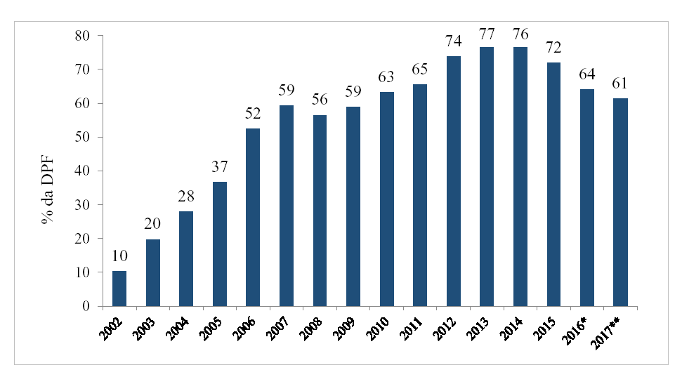9 Isso ocorre porque, tudo o mais constante, as emissões líquidas da DPF têm como contrapartida a redução no volume de operações compromissadas de responsabilidade do Banco Central. Ou seja, tal política resulta em uma troca, entre duas instituições governamentais, de seus passivos junto ao público, sem que haja alteração nos estoques da DLSP e da DBGG.