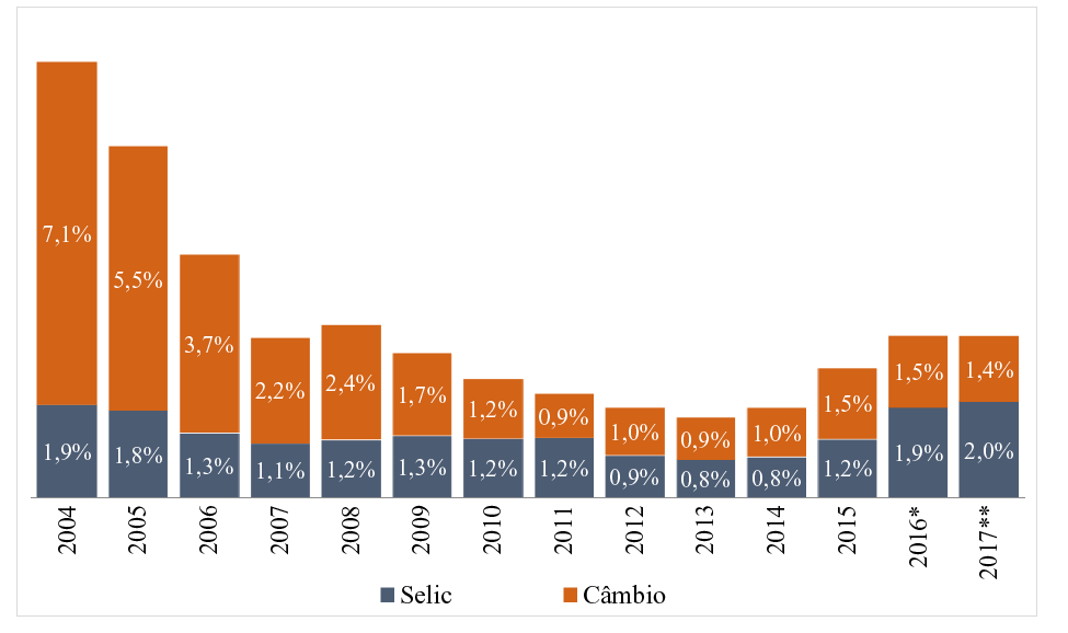 11 Trata-se de uma análise estática, onde analisa-se o efeito isolado da variação de apenas uma variável (taxa de câmbio, taxa de juros ou inflação) sobre os indicadores desejados (DPF, Despesa Orçamentária e DLSP). Dessa forma, não são levados em conta os efeitos da alteração de uma variável sobre as outras variáveis. Também não são levados em conta os efeitos da alteração de uma variável sobre outros fatores da economia que poderiam também afetar os indicadores desejados, tais como resultado fiscal, PIB e necessidade líquida de financiamento do setor público.