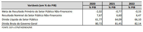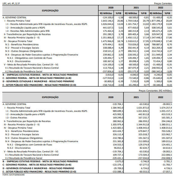 “Art. 2º A elaboração e a aprovação do Projeto de Lei Orçamentária de 2020 e a execução da respectiva Lei deverão ser compatíveis com a obtenção da meta de deficit primário de R$ 124.100.000.000,00 (cento e vinte e quatro bilhões e cem milhões de reais) para os Orçamentos Fiscal e da Seguridade Social e de R$ 3.810.000.000,00 (três bilhões oitocentos e dez milhões de reais) para o Programa de Dispêndios Globais, conforme demonstrado no Anexo de Metas Fiscais constante do Anexo IV a esta Lei.