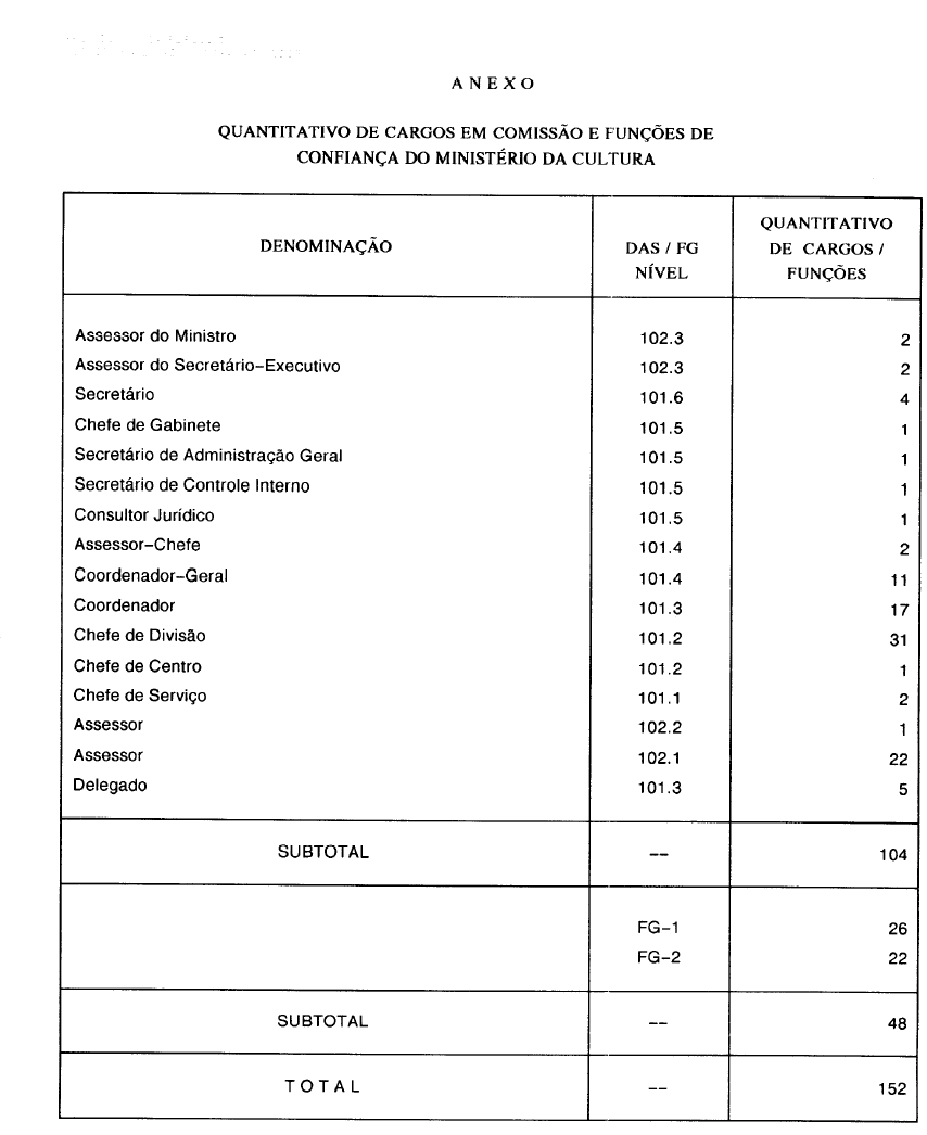 Art. 3° O Ministério da Cultura passa a ter o quantitativo de cargos em comissão e funções de confiança constante do Anexo a este decreto.