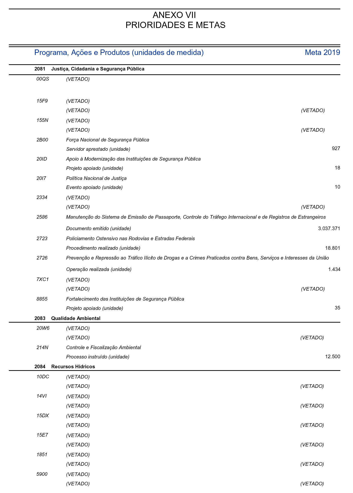 Art. 3º As prioridades e as metas da administração pública federal para o exercício de 2019, atendidas as despesas contidas no Anexo III e as de funcionamento dos órgãos e das entidades que integram os Orçamentos Fiscal e da Seguridade Social, correspondem às programações orçamentárias constantes do Anexo VII .