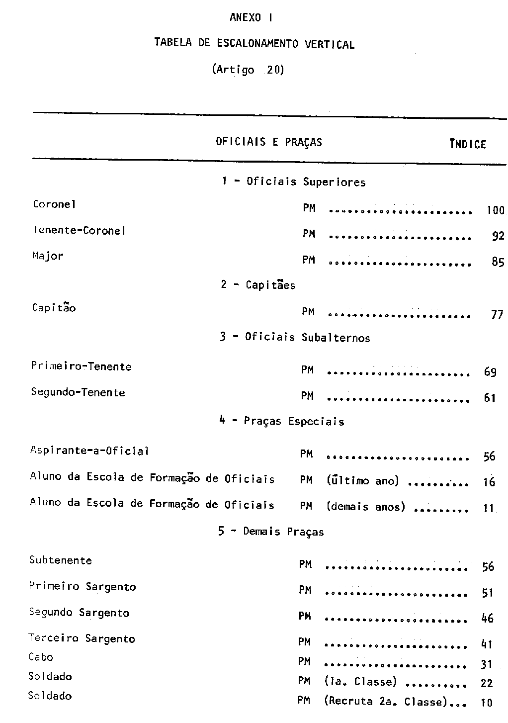 Art. 20. O valor do soldo será fixado para cada posto ou graduação, com base no soldo de Coronel PM, observados os índices estabelecidos na Tabela de Escalonamento Vertical, anexa a este Decreto (Anexo I).