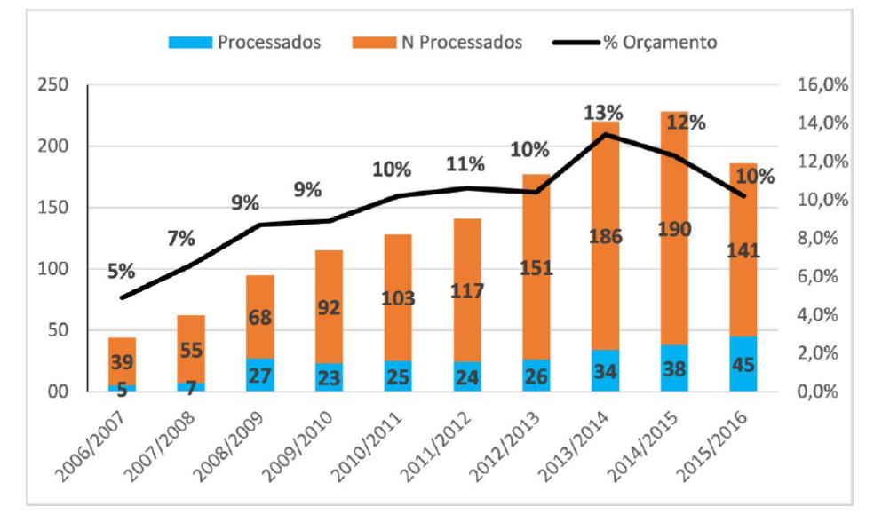 5 A evolução do estoque de beneficiários do BPC quase dobrou em 10 anos, passando de 2,2 milhões, em 2005, para 4,2 milhões, em 2015. O gasto anual do governo com o benefício saltou de R$7,5 bilhões, em 2005, para R$39,6 bilhões, em 2015. Quanto ao fluxo, houve concessão média de 337 mil benefícios ao ano, durante esse período.