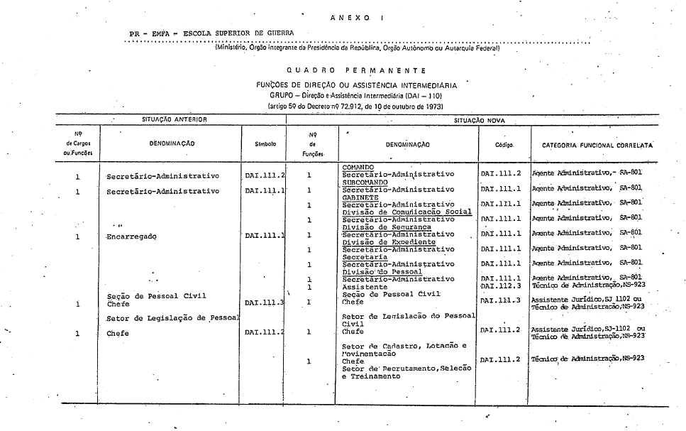 . 1º - São criadas, mantidas, reclassificadas e transformadas funções, na forma do Anexo I deste decreto, para composição das Categorias Direção Intermediária, código: DAI-111, e Assistência Intermediária, código: DAI-112, do Grupo-Direção e Assistência Intermediárias, código: DAI-110, do Quadro Permanente da EscoIa Superior de Guerra.