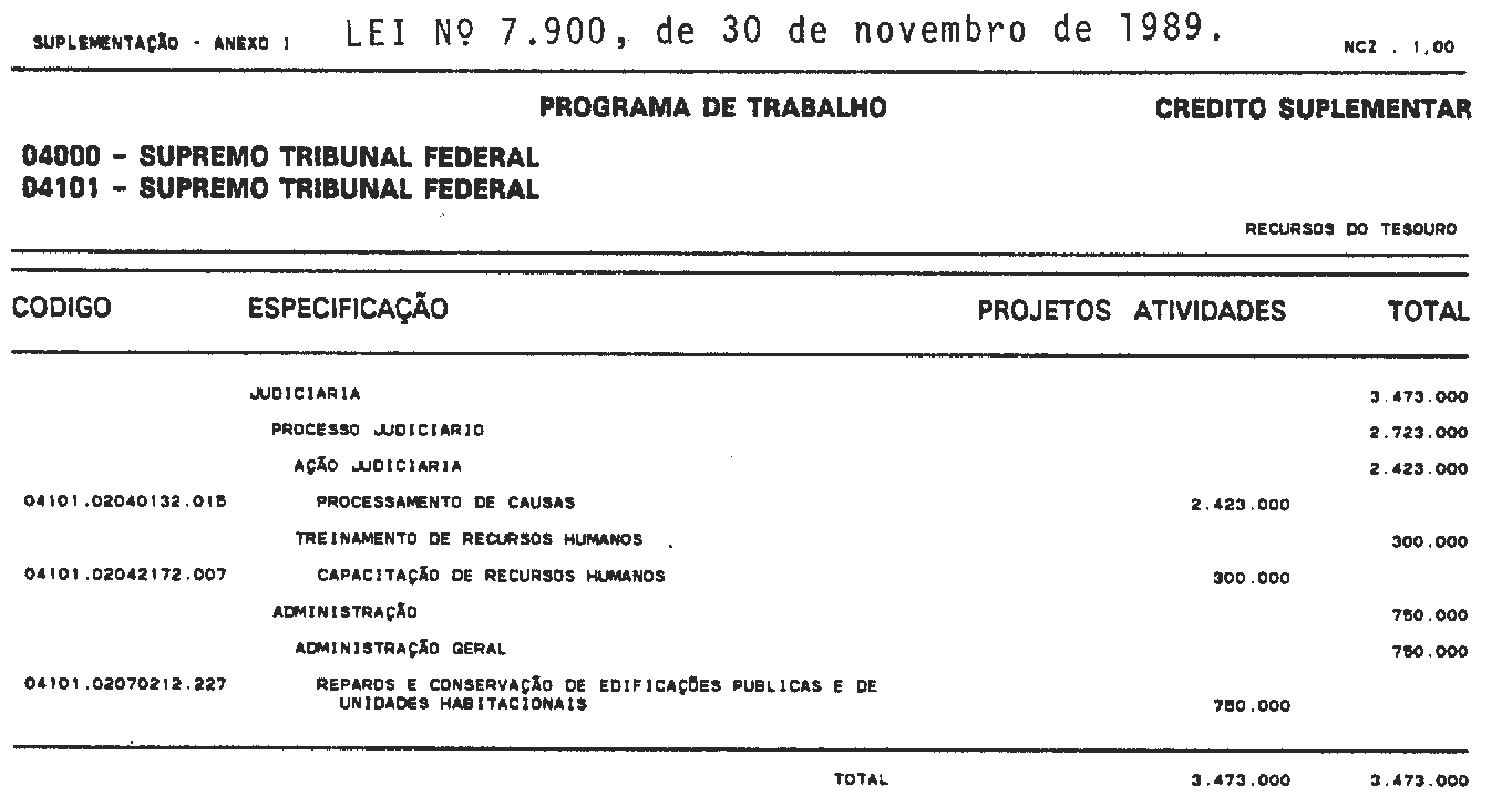 Art. 1º. É o Poder Executivo autorizado a abrir ao Orçamento Fiscal da União (Lei nº. 7.715, de 3 de janeiro de 1989), Anexo II, crédito suplementar até o limite de NCz$ 3.473.000,00 (três milhões, quatrocentos e setenta e três mil cruzados novos), em favor do Supremo Tribunal Federal de conformidade com a programação constante do Anexo I desta Lei.