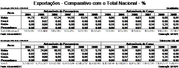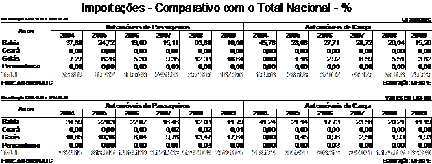 4. Por sua vez, uma observação sobre o desempenho das relações comerciais ligadas ao setor automobilístico nos estados das regiões mencionadas, traduz a assertiva da medida deflagrada. Verifica-se que o Estado da Bahia assumiu participação significativa nas exportações de veículos automotores produzidos no Brasil, enquanto que o Estado de Goiás experimenta papel importante na importação desses veículos.