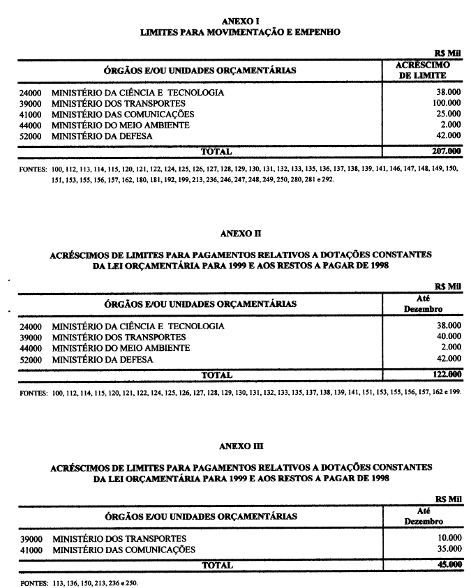 "Art. 3º O pagamento de despesas no exercício de 1999, inclusive os "restos a pagar" do exercício de 1998, relativos às despesas de que trata o art. 1 o, fica limitado a R$ 35.844.232.000,00 (trinta e cinco bilhões, oitocentos e quarenta e quatro milhões, duzentos e trinta e dois mil reais), obedecida a distribuição constante dos Anexos II, III e IV deste Decreto.