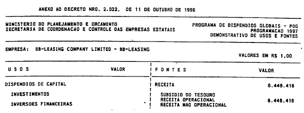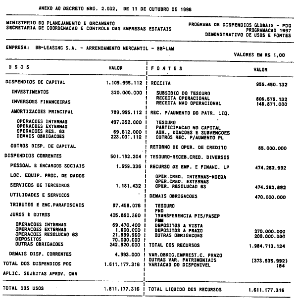 | Aprova o Programa de Dispêndios Globais - PDG das empresas estatais federais para 1997, e dá outras providências. |