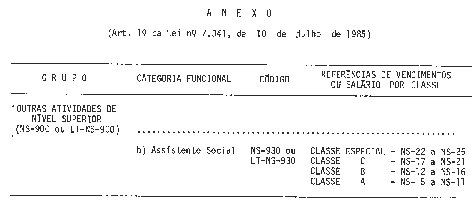 Art. 1º - A Categoria Funcional de Assistente Social, Código NS-930 ou LT-NS-930, do Grupo-Outras Atividades de Nível Superior, a que se refere a Lei nº 5.645 de 10 de dezembro de 1970, fica alterada na forma constante do Anexo desta Lei.