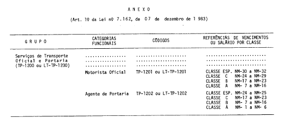 Art. 1º - As Categorias Funcionais de Motorista Oficial, código TP-1201 ou LT-TP-1201, e de Agente de Portaria, código TP-1202 ou LT-TP-1202, do Grupo-Serviços de Transporte Oficial e Portaria, a que se refere a lei nº 5.645, de 10 de dezembro de 1970, ficam alteradas na forma constante do anexo desta Lei.