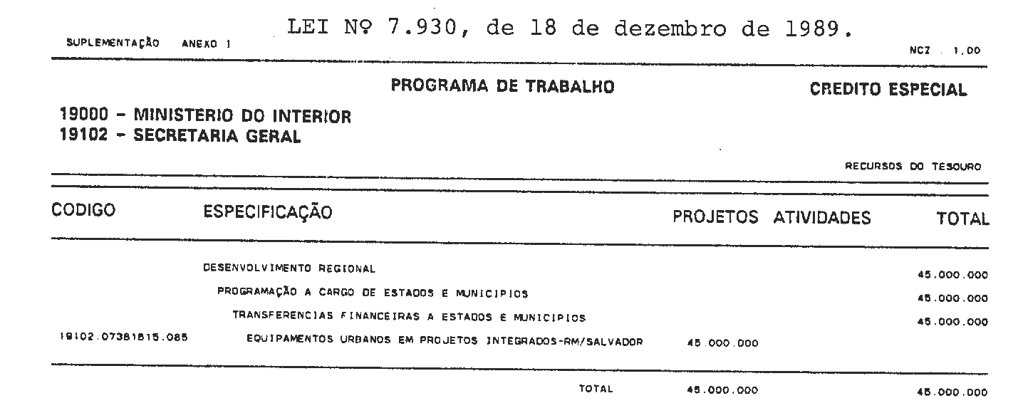 Art. 1° É o Poder Executivo autorizado a abrir ao Orçamento Fiscal da União (Lei n° 7.715, de 3 de janeiro de 1989) crédito especial até o limite de NCz$ 45.000.000,00 (quarenta e cinco milhões de cruzados novos), em favor do Ministério do Interior, de conformidade com a programação constante do Anexo I desta Lei.