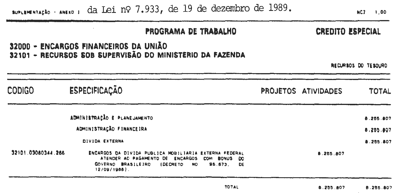 Art. 1° É o Poder Executivo autorizado a abrir ao Orçamento Fiscal da União, Lei n° 7.715, de 3 de janeiro de 1989, crédito especial até o limite de NCz$8.255.807,00 (oito milhões, duzentos e cinqüenta e cinco mil, oitocentos e sete cruzados novos), para a programação constante do Anexo I desta Lei.